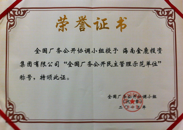 10月28日,金鹿集團公司被全國廠務公開協調小組授予“全國廠務公開民主管理示范單位”榮譽稱號,是海南省兩個示范單位之一。