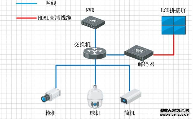 小型的監控系統組成非常簡單,通常就是前端幾個攝像頭,然后接交換機,交換機接NVR,NVR直接連接顯示器,直接在顯示器上預覽畫面,NVR的解碼能力比DVR的解碼能力更強,現在普通的NVR都是支持1-8路的1080P的攝像頭解碼,但最近幾年也出現幾款的高端NVR,集成更加強大的解碼功能,但絲毫未改變NVR就是存儲的產品,所以一般通過NVR顯示,都是應用在一些低端,點位數較小的項目中,比如超市和店鋪這類預算較低的項目。同DVR顯示一樣,普通的NVR的監控上墻也會遇到畫面切換控制不方便,且不支持視頻畫面開窗漫游等功能。